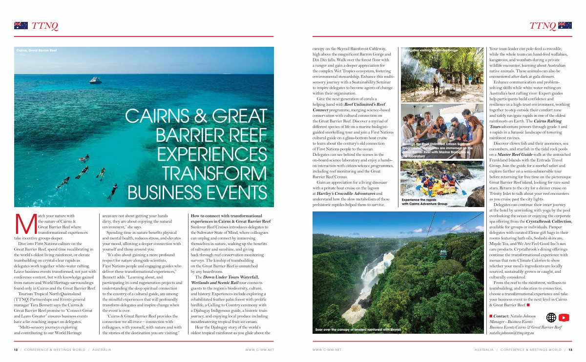 Tourism Tropical North Queensland( TTNQ) Partnerships and Events general manager Tara Bennett says the Cairns & Great Barrier Reef promise to“ Connect Great and Leave Greater” ensures business events have a far-reaching impact on delegates.“ Multi-sensory journeys exploring and contributing to our World Heritage