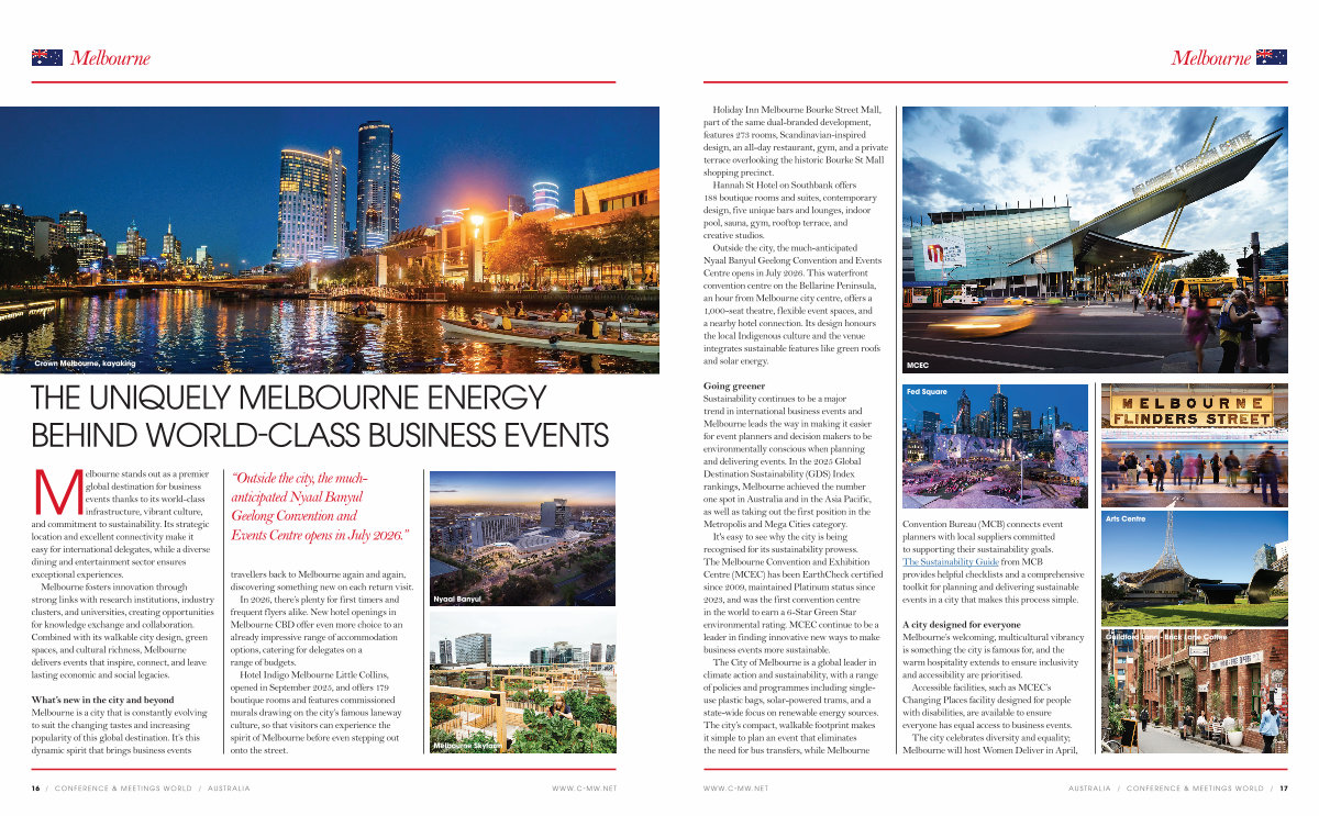 Melbourne stands out as a premier global destination for business events thanks to its world-class infrastructure, vibrant culture, and commitment to sustainability. Its strategic location and excellent connectivity make it easy for international delegates, while a diverse dining and entertainment sector ensures exceptional experiences.
