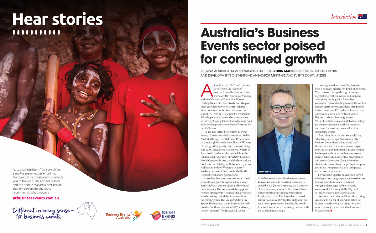 Looking ahead, sustainability has long been a strategic priority for Tourism Australia. We champion change through advocacy, highlighting that our venues and suppliers are already leading, with Australia’ s convention centres holding some of the world’ s highest certifications. Examples of impactful initiatives include ICC Sydney’ s Low Carbon Menus and Cairns Convention Centre’ s Reforest carbon offset programme. We will continue to use our global marketing platform to communicate these successes and meet the growing demand for more sustainable events.