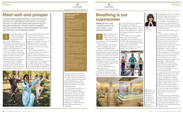 CAESARS ENTERTAINMENT RECENTLY LAUNCHED WELLNESS OPTIONS FOR CONFERENCES AND EVENTS IN LAS VEGAS . ATLANTIC CITY AND RENO / TAHOE ARE SOON TO FOLLOW . WELLNESS IS NOW MUCH SOUGHT AFTER BY PLANNERS . HERE THE CAESARS TEAM OUTLINES THE BENEFITS OF PUTTING WELLNESS HIGH ON THE MEETINGS AGENDA
