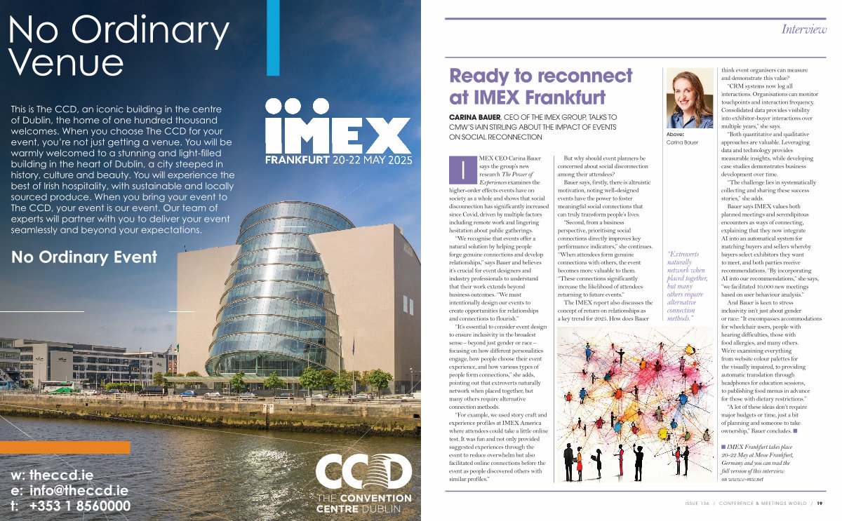 CARINA BAUER, CEO OF THE IMEX GROUP, TALKS TO CMW’ S IAIN STIRLING ABOUT THE IMPACT OF EVENTS ON SOCIAL RECONNECTION