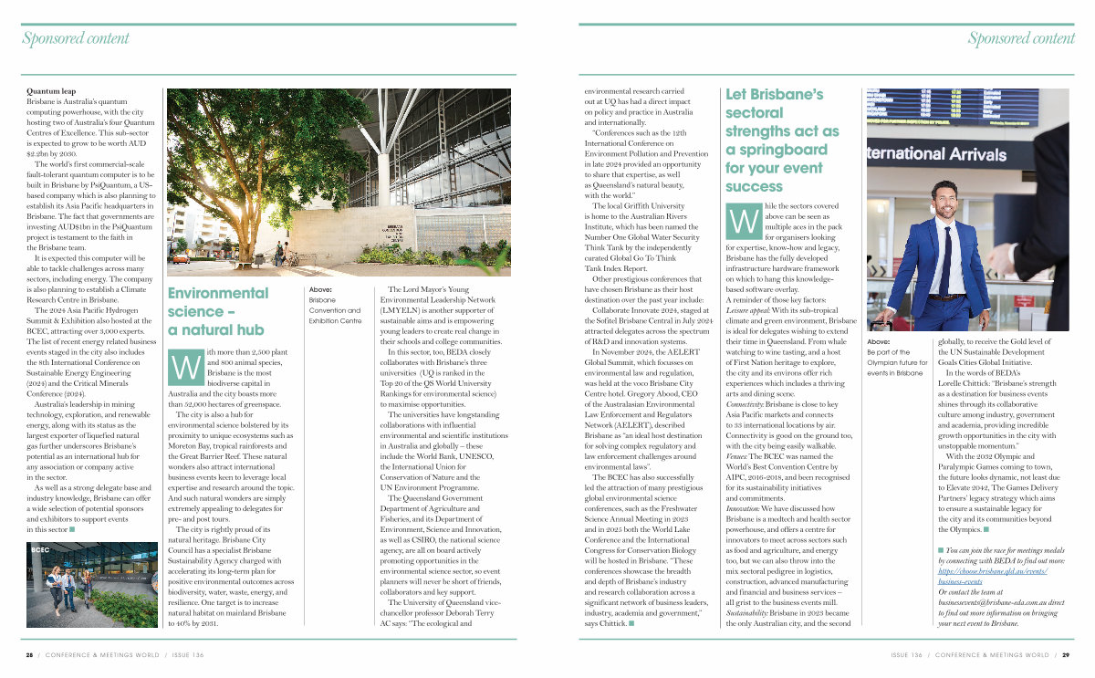 The BCEC has also successfully led the attraction of many prestigious global environmental science conferences, such as the Freshwater Science Annual Meeting in 2023 and in 2025 both the World Lake Conference and the International Congress for Conservation Biology will be hosted in Brisbane.“ These conferences showcase the breadth and depth of Brisbane’ s industry and research collaboration across a significant network of business leaders, industry, academia and government,” says Chittick. n