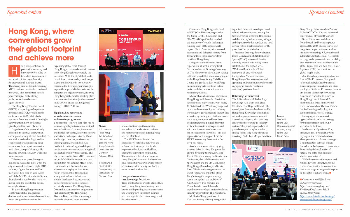 With the success of inaugural and returned events, Hong Kong is the choice of destination for conventions which aim to grow its global footprint or delegates to achieve more. n