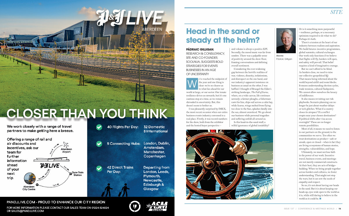 There’ s a tension at the heart of our industry between realism and aspiration. We build futures: incentive programmes, global summits, cultural exchanges. Our work only functions if we believe that flights will fly, borders will open, and safety will prevail. That belief requires a kind of imaginative courage.