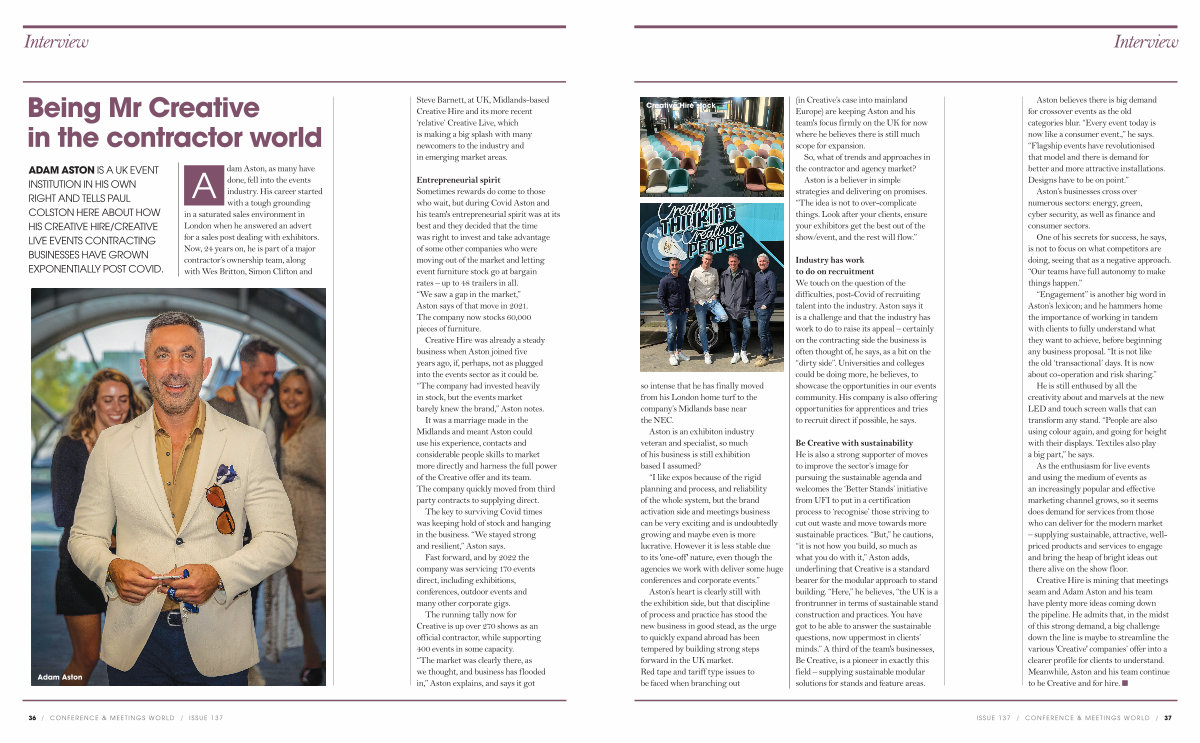 Industry has work to do on recruitment We touch on the question of the difficulties, post-Covid of recruiting talent into the industry. Aston says it is a challenge and that the industry has work to do to raise its appeal – certainly on the contracting side the business is often thought of, he says, as a bit on the“ dirty side”. Universities and colleges could be doing more, he believes, to showcase the opportunities in our events community. His company is also offering opportunities for apprentices and tries to recruit direct if possible, he says.