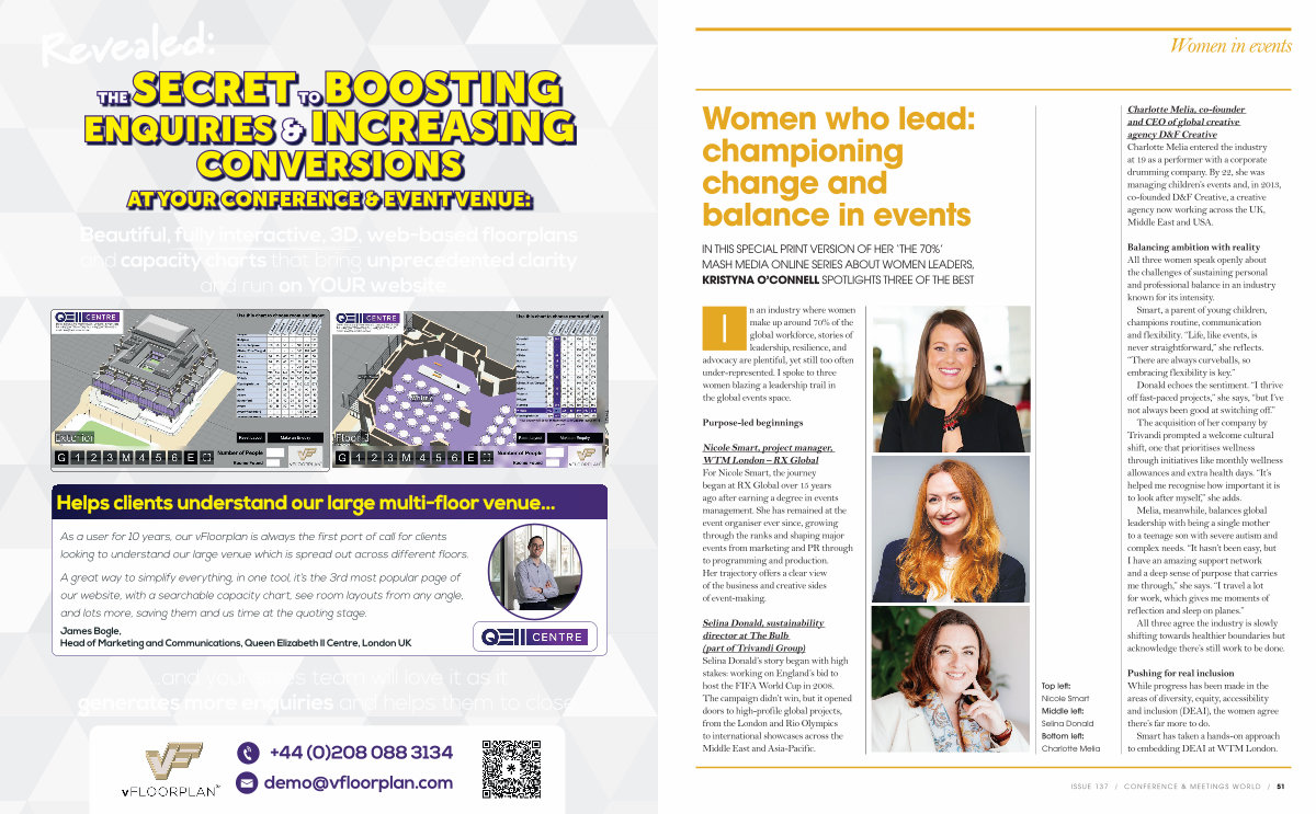 I n an industry where women make up around 70 % of the global workforce, stories of leadership, resilience, and advocacy are plentiful, yet still too often under-represented. I spoke to three women blazing a leadership trail in the global events space.