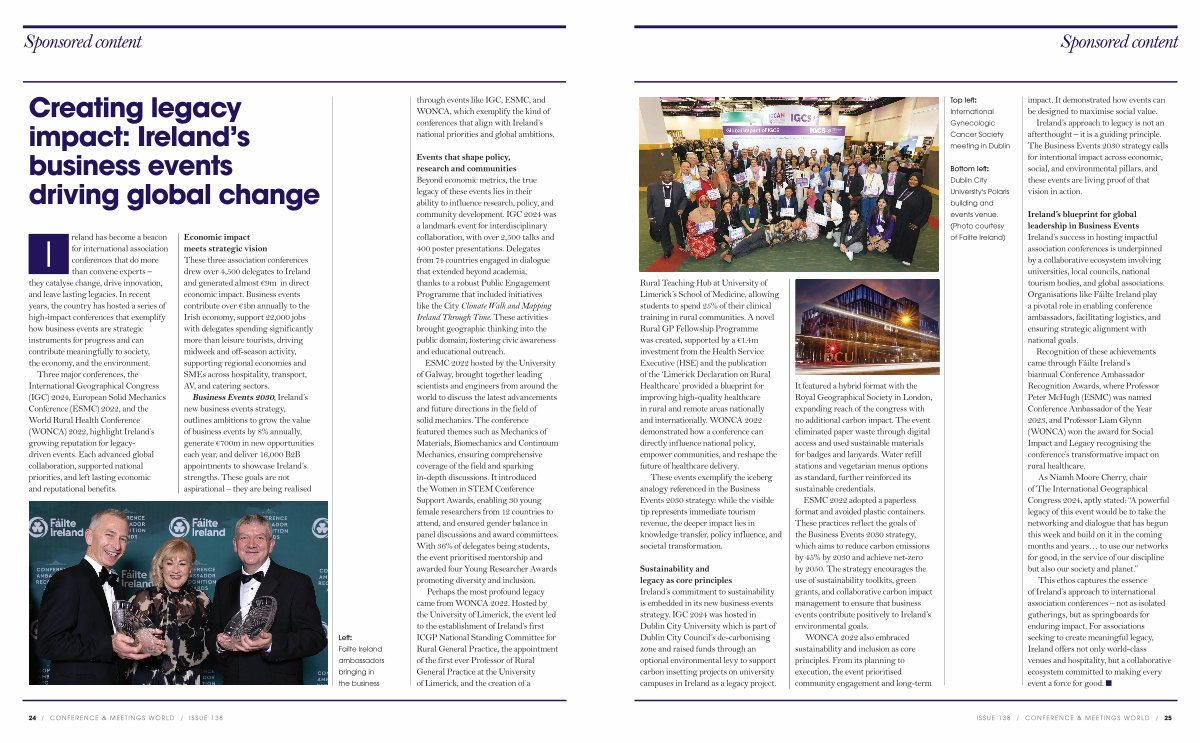This ethos captures the essence of Ireland’ s approach to international association conferences – not as isolated gatherings, but as springboards for enduring impact. For associations seeking to create meaningful legacy, Ireland offers not only world-class venues and hospitality, but a collaborative ecosystem committed to making every event a force for good. n