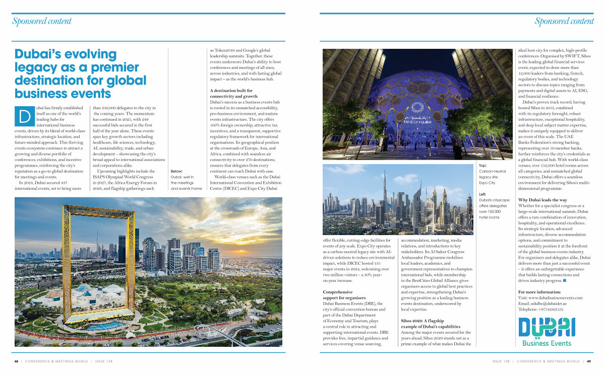 itself as one of the world’ s leading hubs for international business events, driven by its blend of world-class infrastructure, strategic location, and future-minded approach. This thriving events ecosystem continues to attract a growing and diverse portfolio of conferences, exhibitions, and incentive programmes, reinforcing the city’ s reputation as a go-to global destination for meetings and events.