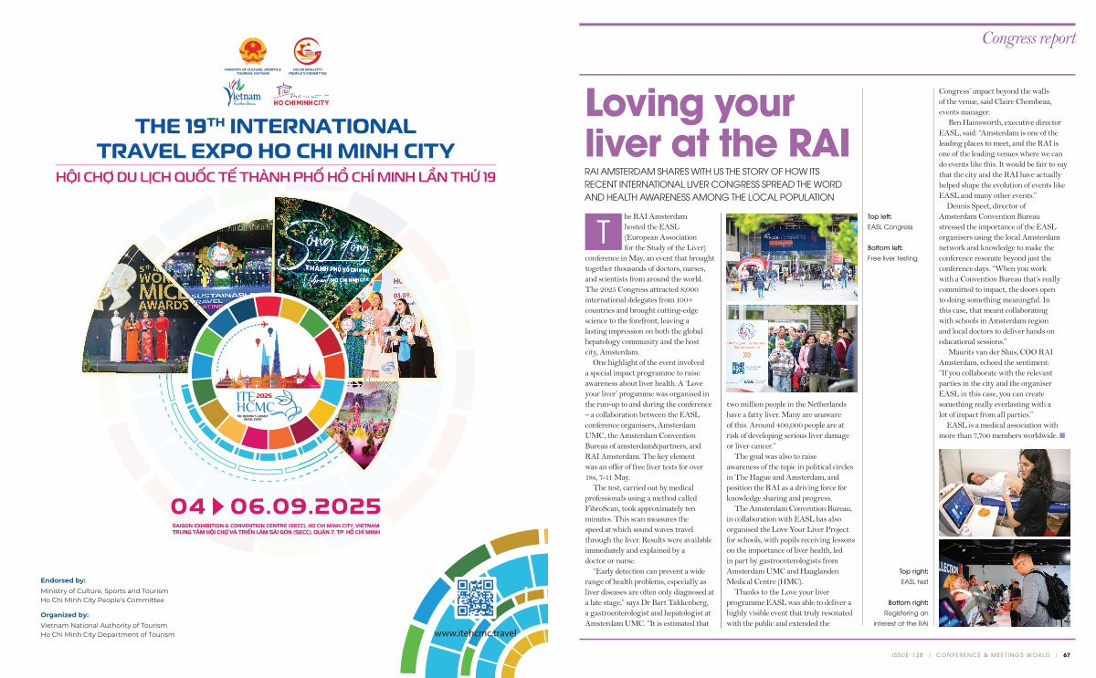 Ben Hainsworth, executive director EASL, said:“ Amsterdam is one of the leading places to meet, and the RAI is one of the leading venues where we can do events like this. It would be fair to say that the city and the RAI have actually helped shape the evolution of events like EASL and many other events.” Dennis Speet, director of Amsterdam Convention Bureau stressed the importance of the EASL organisers using the local Amsterdam network and knowledge to make the conference resonate beyond just the conference days.“ When you work with a Convention Bureau that’ s really committed to impact, the doors open to doing something meaningful. In this case, that meant collaborating with schools in Amsterdam region and local doctors to deliver hands on educational sessions.”