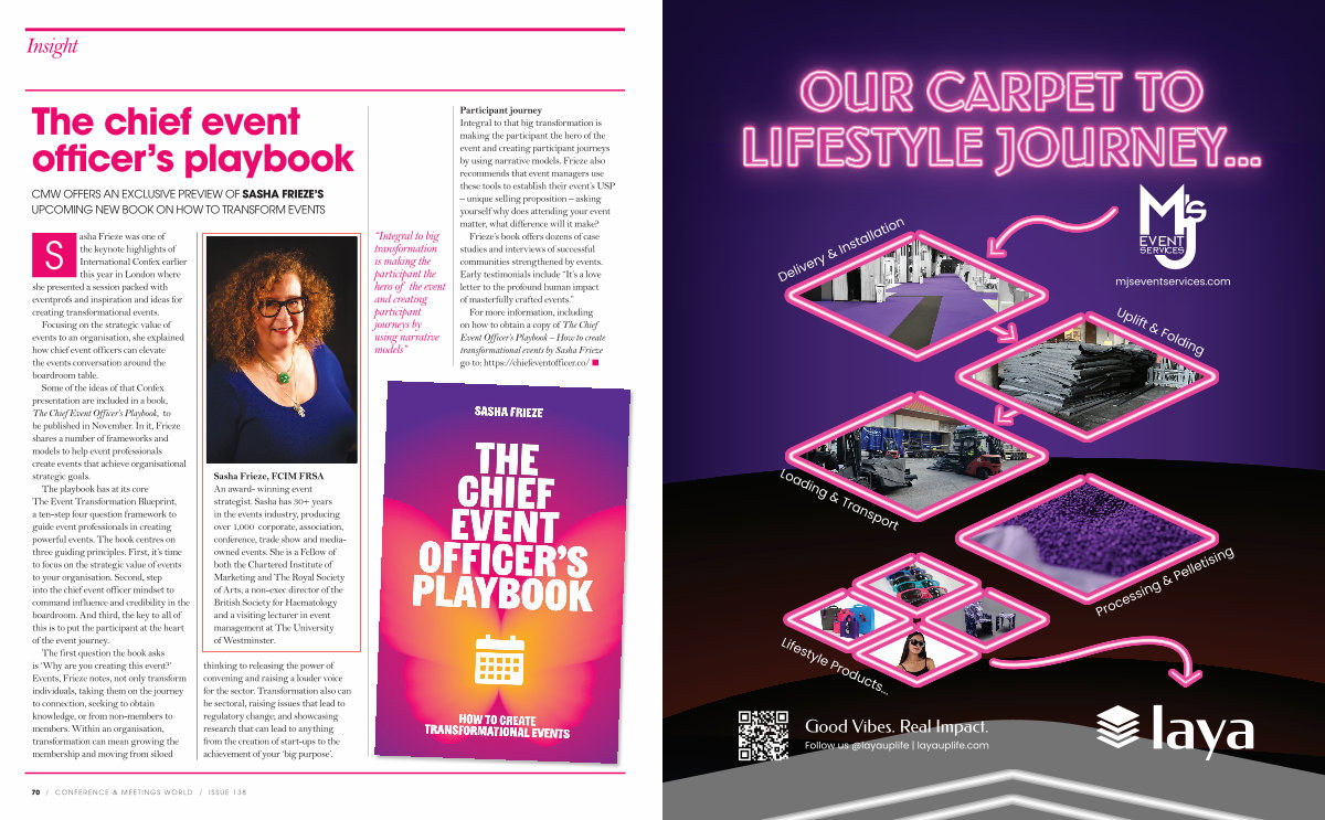 For more information, including on how to obtain a copy of The Chief Event Officer’ s Playbook – How to create transformational events by Sasha Frieze go to: https:// chiefeventofficer. co / n
