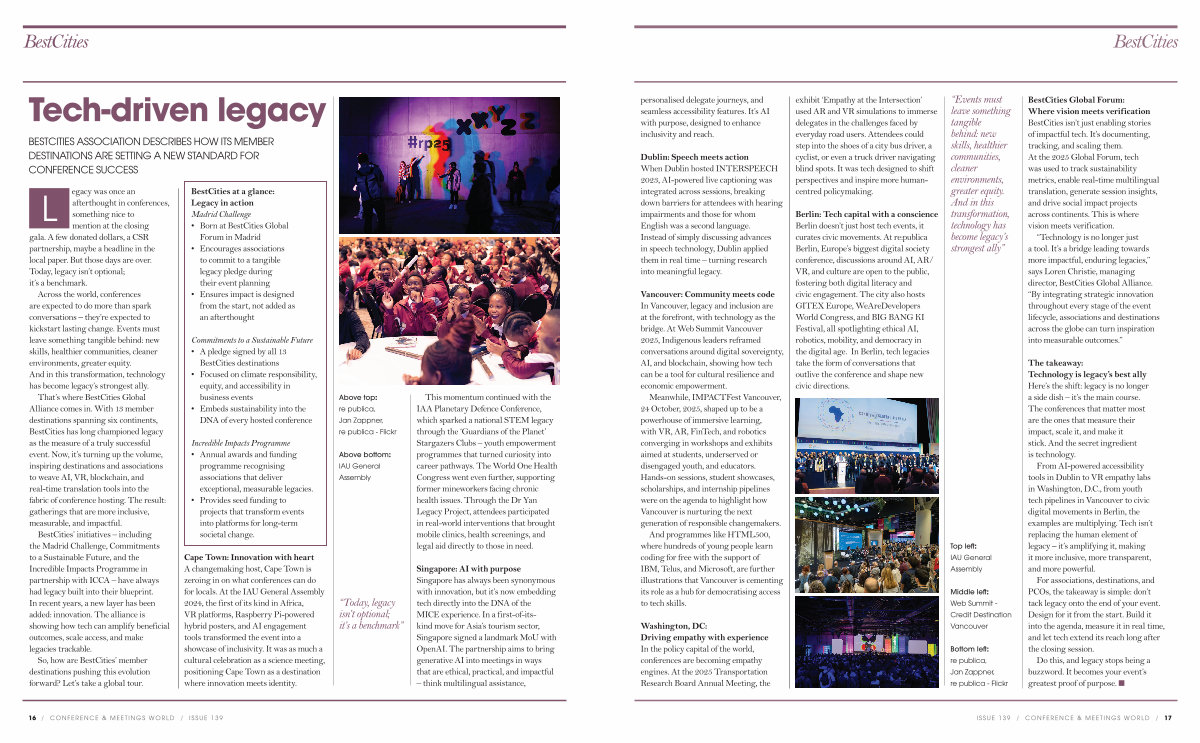“ Technology is no longer just a tool. It’ s a bridge leading towards more impactful, enduring legacies,” says Loren Christie, managing director, BestCities Global Alliance.“ By integrating strategic innovation throughout every stage of the event lifecycle, associations and destinations across the globe can turn inspiration into measurable outcomes.”