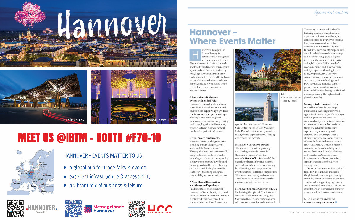 Hannover Convention Bureau: The one-stop contact for planning and hosting successful events in the city and region. Under the motto‘ A Guest of Professionals’, the experienced team offers free support with tailored solutions, venue scouting, hotel bookings, and comprehensive event expertise – all from a single source. This saves time, money and resources – and helps discover a destination that elevates events to the next level.