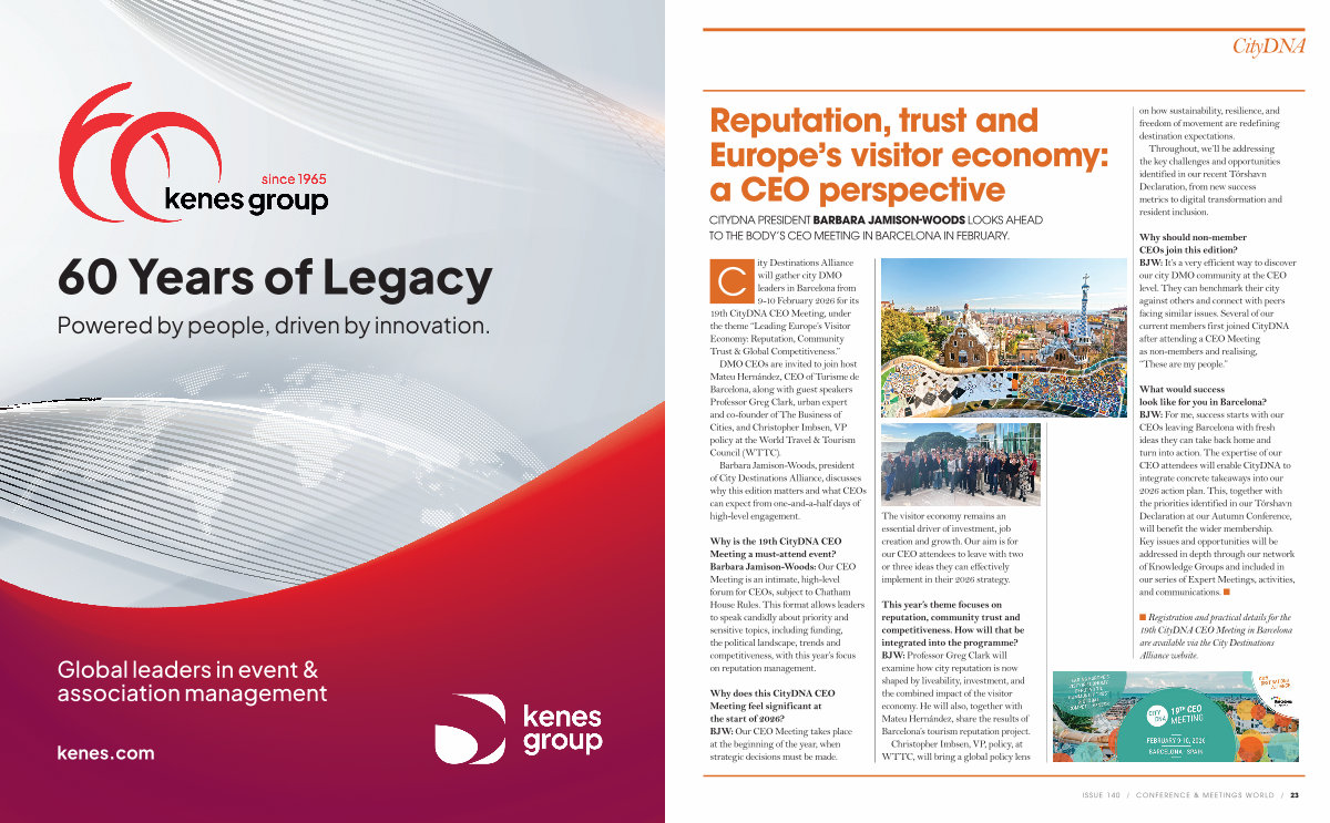 will gather city DMO leaders in Barcelona from 9-10 February 2026 for its 19th CityDNA CEO Meeting, under the theme“ Leading Europe’ s Visitor Economy: Reputation, Community Trust & Global Competitiveness.”