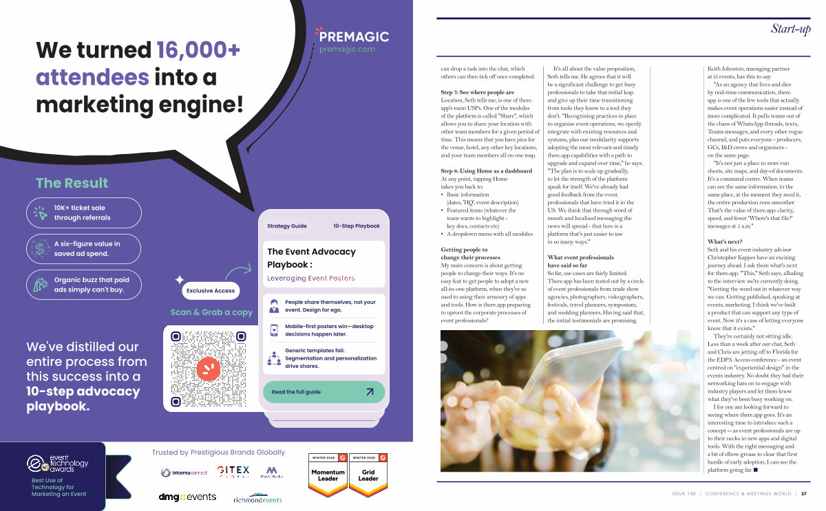 What ' s next? Seth and his event industry advisor Christopher Kappes have an exciting journey ahead. I ask them what ' s next for there. app. " This," Seth says, alluding to the interview we ' re currently doing. " Getting the word out in whatever way we can. Getting published, speaking at events, marketing. I think we ' ve built a product that can support any type of event. Now it ' s a case of letting everyone know that it exists."
