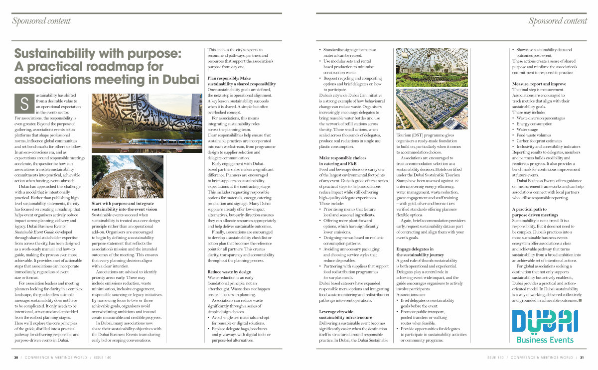 Dubai has approached this challenge with a model that is intentionally practical. Rather than publishing high level sustainability statements, the city has focused on creating a roadmap that helps event organisers actively reduce impact across planning, delivery and legacy. Dubai Business Events’ Sustainable Event Guide, developed through shared stakeholder expertise from across the city, has been designed as a work-ready manual and how-to guide, making the process even more achievable. It provides a set of actionable steps that associations can incorporate immediately, regardless of event size or format.