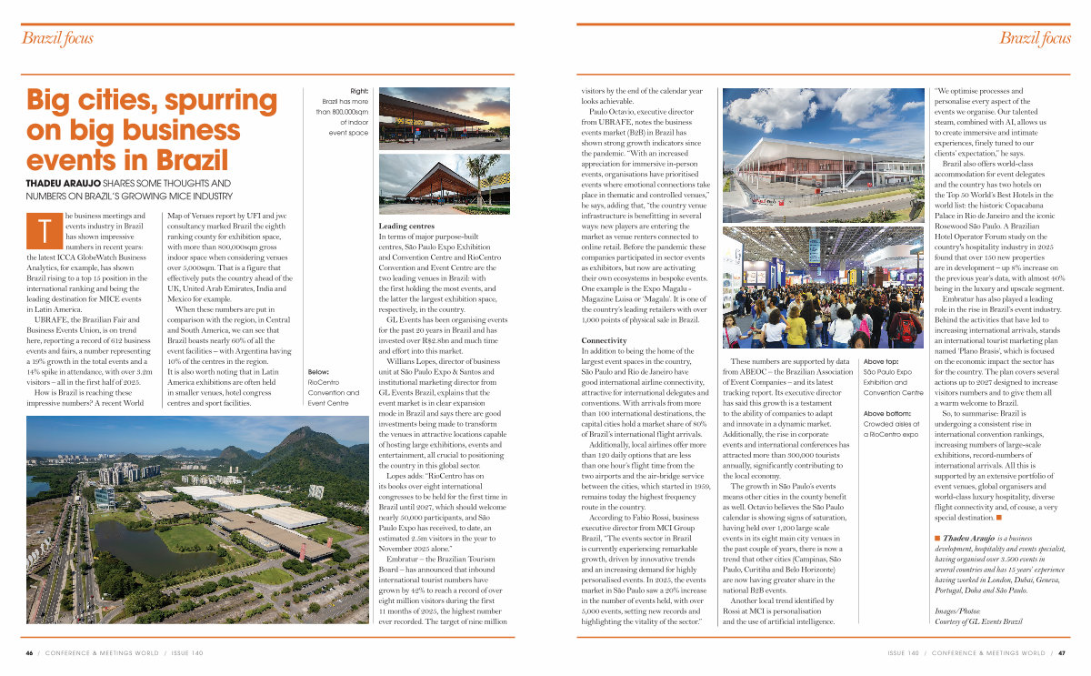 So, to summarise: Brazil is undergoing a consistent rise in international convention rankings, increasing numbers of large-scale exhibitions, record-numbers of international arrivals. All this is supported by an extensive portfolio of event venues, global organisers and world-class luxury hospitality, diverse flight connectivity and, of couse, a very special destination. n
