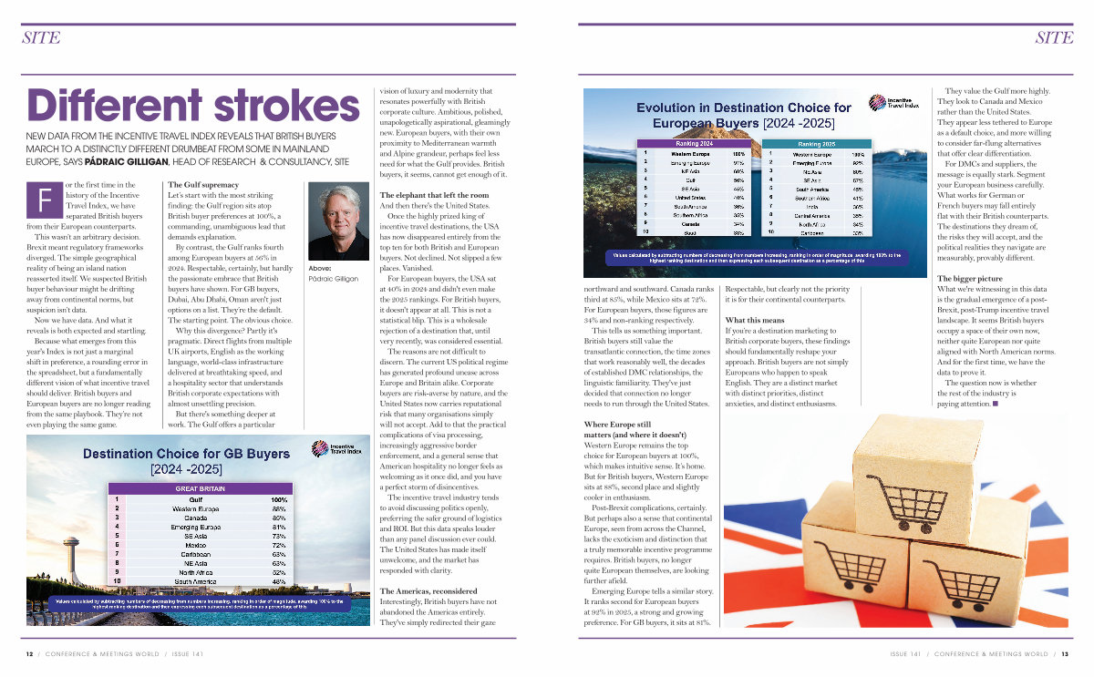 NEW DATA FROM THE INCENTIVE TRAVEL INDEX REVEALS THAT BRITISH BUYERS MARCH TO A DISTINCTLY DIFFERENT DRUMBEAT FROM SOME IN MAINLAND EUROPE, SAYS PÁDRAIC GILLIGAN, HEAD OF RESEARCH & CONSULTANCY, SITE