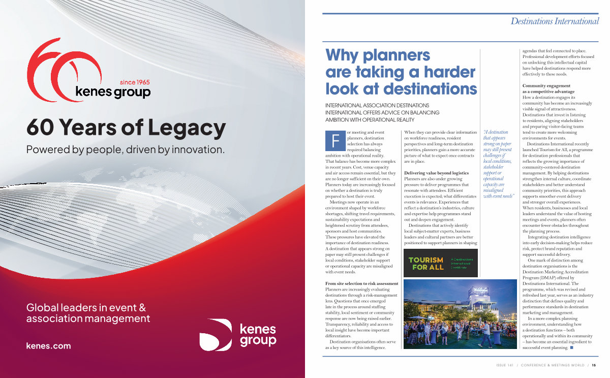 Destinations International recently launched Tourism for All, a programme for destination professionals that reflects the growing importance of community-centered destination management. By helping destinations strengthen internal culture, coordinate stakeholders and better understand community priorities, this approach supports smoother event delivery and stronger overall experiences. When residents, businesses and local leaders understand the value of hosting meetings and events, planners often encounter fewer obstacles throughout the planning process.