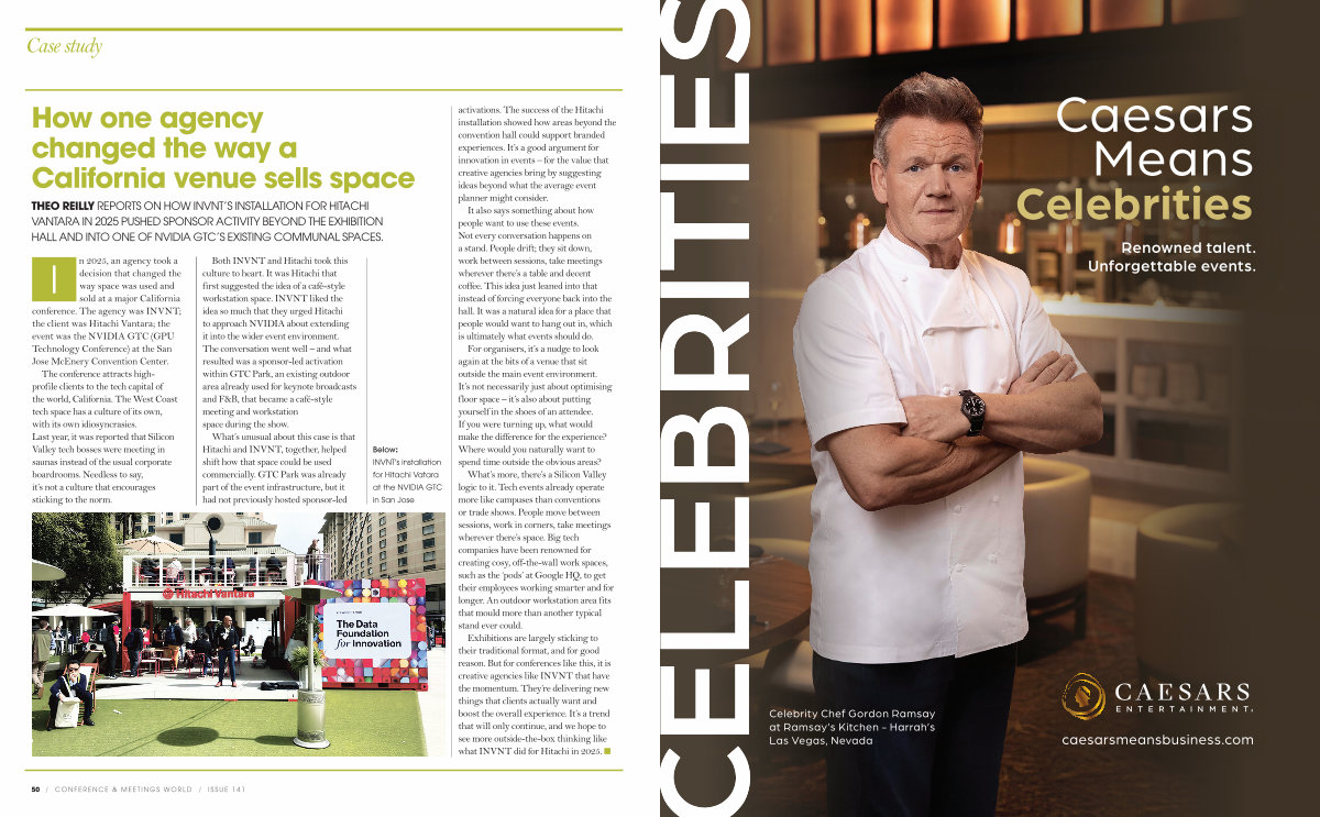 I n 2025, an agency took a decision that changed the way space was used and sold at a major California conference. The agency was INVNT; the client was Hitachi Vantara; the event was the NVIDIA GTC( GPU Technology Conference) at the San Jose McEnery Convention Center. The conference attracts highprofile clients to the tech capital of the world, California. The West Coast tech space has a culture of its own, with its own idiosyncrasies. Last year, it was reported that Silicon Valley tech bosses were meeting in saunas instead of the usual corporate boardrooms. Needless to say, it’ s not a culture that encourages sticking to the norm.