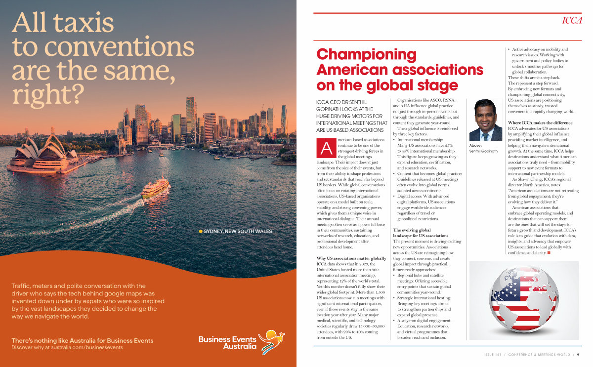 continue to be one of the strongest driving forces in the global meetings landscape. Their impact doesn’ t just come from the size of their events, but from their ability to shape professions and set standards that reach far beyond US borders. While global conversations often focus on rotating international associations, US-based organisations operate on a model built on scale, stability, and strong convening power, which gives them a unique voice in international dialogue. Their annual meetings often serve as a powerful force in their communities, sustaining networks of research, education, and professional development after attendees head home.