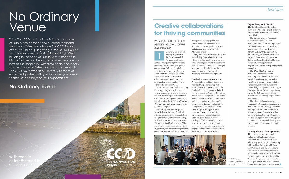 T he historic city of Dublin recently played host to the BestCities Global Forum, where industry leaders converged to explore‘ Creative collaborations: Innovating for greater communities’. In Ireland’ s capital – named the 2024 European Capital of Smart Tourism – delegates examined how collaborative approaches can drive innovation, foster inclusivity, and transform global challenges into community-driven solutions.