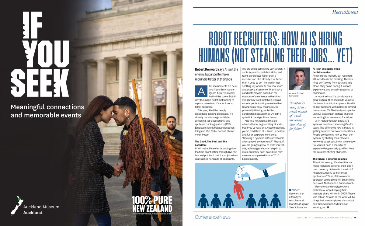you are doing something very wrong). It spots keywords, matches skills, and ranks candidates faster than a recruiter can. It is already a lot better than it used to be – instead of just spotting key words, AI can now‘ read’ and assess a sentence, fit and put a candidate forward based on the nuances of a sentence rather than straight key word matching. This all sounds perfect until you realise that relying solely on AI means you’ re potentially filtering out brilliant candidates because their CV didn’ t quite tick the algorithm’ s boxes.