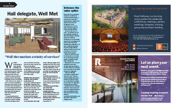 Shane Simmons, marketing and sales coordinator at ConferenceHertfordshire, is based at the University of Hertfordshire in Hatfield, and says the new economic background means universities have much to offer, not least because of their pioneering facilities. Venues should focus on value, competitiveness and developing the experience, Simmons believes.“ Steering away from traditional destinations to create lasting experiences for delegates has been an important factor identified from organisers,” he adds.“ Hatfield particularly has rich heritage with the aviation industry and the close proximity to London has enhanced the appeal.” Simmons notes 2016 saw the introduction of an online bed and breakfast booking system, including for large scale conferences. Rising tuition fees mean the facilities become a key decision factor for students, he adds, which has created, in turn, more valued commercial products for organisers.“ We are continually committed to adding value,” adds Simmons,“ this year offering organisers in-house solutions to take the stress out of organising. Everything from transport to registration and payment processes.” Investment in the University includes in new spaces such as the Art Gallery, Mezzanine, Law Court building, Hutton Hub and Chapman Lounge, while the conferencehertfordshire. co. uk site offers useful tips for organisers also. www. conference-news. co. uk