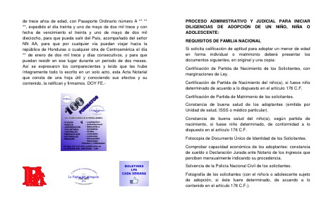 de trece años de edad, con Pasaporte Ordinario número A ** ** **, expedido el día treinta y uno de mayo de dos mil trece y con fecha de vencimiento el treinta y uno de mayo de dos mil dieciocho, para que pueda salir del País, acompañado del señor NN AA, para que por cualquier vía puedan viajar hacia la república de Honduras o cualquier otra de Centroamérica el día ** de enero de dos mil trece y días consecutivos, y para que puedan residir en ese lugar durante un periodo de dos meses. Así se expresaron los comparecientes y leído que les hube íntegramente todo lo escrito en un solo acto, esta Acta Notarial que consta de una hoja útil y conociendo sus efectos y su contenido, la ratifican y firmamos. DOY FE.-