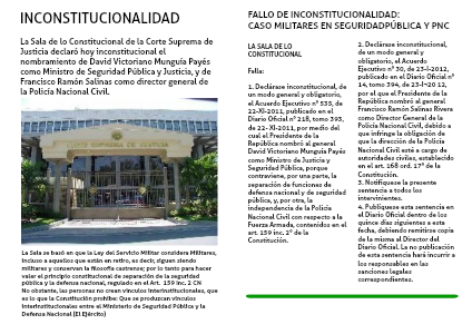 2. Declárase inconstitucional, de un modo general y obligatorio, el Acuerdo Ejecutivo n° 30, de 23-I-2012, publicado en el Diario Oficial n° 14, tomo 394, de 23-I¬20 12, por el que el Presidente de la República nombró al general Francisco Ramón Salinas Rivera como Director General de la Policía Nacional Civil, debido a que infringe la obligación de que la dirección de la Policía Nacional Civil esté a cargo de autoridades civiles, establecido en el art. 168 ord. 17° de la Constitución.