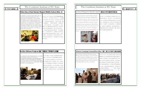 为了向当地广大汉语学习者提供更好的学习 资源, 北卡州大孔子学院积极组织各种活 动, 深入到北卡州各地区大中小学及社区, 推广网络孔子学院, 向老师 、 学生 、 社区各 界人士介绍网络孔子学院网站上丰富多彩的 汉语语言文化资源 。 自今年 3 月份起, 目前已 有超过 200 人注册网络孔子学院 。 目前该活动 还在继续, 计划秋季开学前, 注册人数达 500 人 。