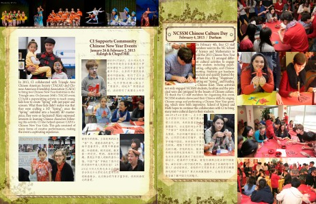 2013 年 1 月 26 日, 北卡州大孔子 学院和华美协会在美国北卡罗 利市博览中心共同举办了春节 嘉年华会 。 众多的中国民俗表 演和中国食物, 吸引了北卡当 地居民和中国人同贺蛇年的到 来 。 孔子学院还精心推出了“ 剪春字, 迎蛇年” 的剪纸活 动, 活动吸引了美国本土和华