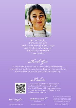 If you would like to leave a message of condolence for Conja ’ s family simply scan this QR code with your smartphone to be directed to Conja ’ s eTribute or visit bethelfunerals . com . au