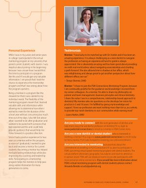 Mentor : “ I chose to join the PDA Connections Mentoring Program , because I am continually grateful for the guidance and knowledge I received from my senior colleagues . As a mentor , I ’ m able to share my philosophy on patient and team management , business principles and clinical dentistry . I share the value I see in a comprehensive , relationship-based approach to dentistry ! My mentee asks me questions as she develops her vision for practice in 5 and 10 years . I ’ m fulfilled by giving my knowledge and support . I love our profession and want nothing more than for us , as a whole , to provide top-notch dentistry to our communities while earning trust .”
