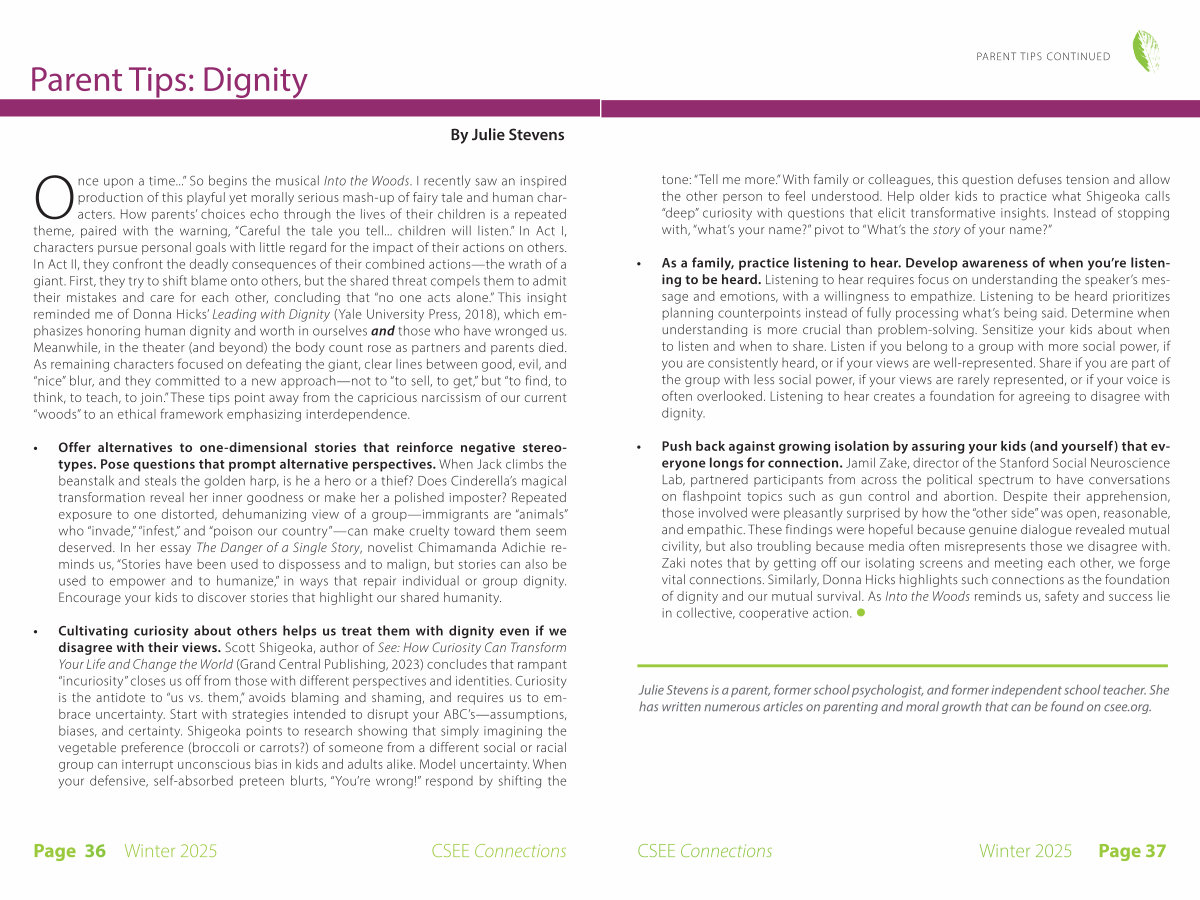 Once upon a time...” So begins the musical Into the Woods. I recently saw an inspired production of this playful yet morally serious mash-up of fairy tale and human characters. How parents’ choices echo through the lives of their children is a repeated theme, paired with the warning,“ Careful the tale you tell... children will listen.” In Act I, characters pursue personal goals with little regard for the impact of their actions on others. In Act II, they confront the deadly consequences of their combined actions— the wrath of a giant. First, they try to shift blame onto others, but the shared threat compels them to admit their mistakes and care for each other, concluding that“ no one acts alone.” This insight reminded me of Donna Hicks’ Leading with Dignity( Yale University Press, 2018), which emphasizes honoring human dignity and worth in ourselves and those who have wronged us. Meanwhile, in the theater( and beyond) the body count rose as partners and parents died. As remaining characters focused on defeating the giant, clear lines between good, evil, and“ nice” blur, and they committed to a new approach— not to“ to sell, to get,” but“ to find, to think, to teach, to join.” These tips point away from the capricious narcissism of our current“ woods” to an ethical framework emphasizing interdependence.