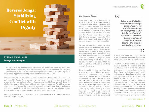 Dignity is one of those concepts that seems akin to mom and apple pie. That is to say, everyone can be united in their support for this concept. This issue of Connections aims to deepen our understanding of dignity. Experiencing and treating others with dignity is an ongoing journey. For instance, many of us became aware of how important it is to speak with more dignity by using terms like an unhoused person versus a homeless person, or an enslaved person versus a slave. Once I switched to these terms that provided more dignity, I was surprised at how it started to change how I understood people in these plights.