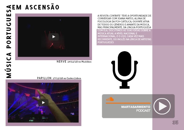 A revista contarte teve a oportunidade de conversar com Joana Matos, aluna de Psicologia da FCH-Católica, ouvinte ativa de todos os géneros e amante da música, mas principalmente, da língua portuguesa. Com ela, discutimos as suas ideias sobre a música atual a nível nacional e internacional, e o uso, cada vez mais recorrente, do inglês na lírica de artistas portugueses