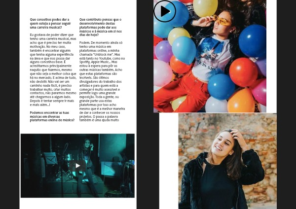 Podem. De momento ainda só tenho uma música em plataformas online, a minha chamada “Unblock me”. Mas está tanto no Youtube, como no Spotify, Apple Music... Mas estou à espera para pôr as outras músicas também. Acho que estas plataformas são incríveis. São ótimos divulgadores do trabalho dos artistas e para quem está a começar é muito acessível e permite logo uma grande exposição. Toda a gente, ou grande parte usa estas plataformas por isso acho mesmo que é a melhor maneira de dar a conhecer os nossos projetos. O passa a palavra também é uma ajuda muito grande. As próprias pessoas gostam de divulgar o que fazes, e isso chega depois a um público ainda considerável.