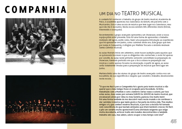 A contarte foi conhecer o trabalho do grupo de teatro musical, Academia de Palco. A academia apareceu nos Salesianos do Estoril, em parceria com o Musicentro. Esta é uma escola de música que tem lugar nos Salesianos, mas que não lhe é exclusivo. Nesta escola existem três diferentes níveis (inicial, intermédio e avançado).