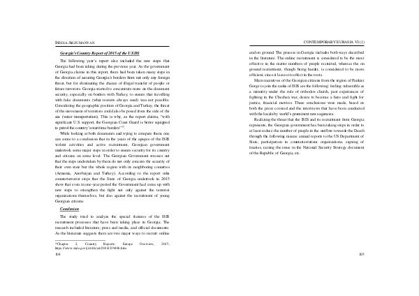 Realizing the threat that the ISIS and its recruitment from Georgia represents, the Georgian government has been taking steps in order to at least reduce the number of people in the outflow towards the Daesh through the following means: annual reports to the US Department of State, participation in counterterrorism organizations, signing of treaties, raising the issue in the National Security Strategy document of the Republic of Georgia, etc.