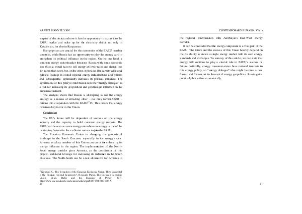 It can be concluded that the energy component is a vital part of the EAEU. The future and the success of this Union heavily depend on the possibility to create a single energy market with its own energy standards and exchanges. To sum up, of this article, we can state that energy will continue to play a crucial role in EAEU’ s success or failure politically, energy consumer-states have national interests in this energy policy, an“ energy dialogue” idea might become a new format and framework in theoretical energy geopolitics, Russia gains politically but suffers economically.