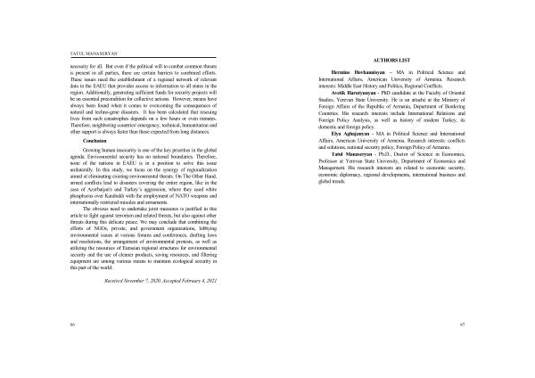 Growing human insecurity is one of the key priorities in the global agenda . Environmental security has no national boundaries . Therefore , none of the nations in EAEU is in a position to solve this issue unilaterally . In this study , we focus on the synergy of regionalization aimed at eliminating existing environmental threats . On The Other Hand , armed conflicts lead to disasters covering the entire region , like in the case of Azerbaijan ' s and Turkey ’ s aggression , where they used white phosphorus over Karabakh with the employment of NATO weapons and internationally restricted missiles and armaments .