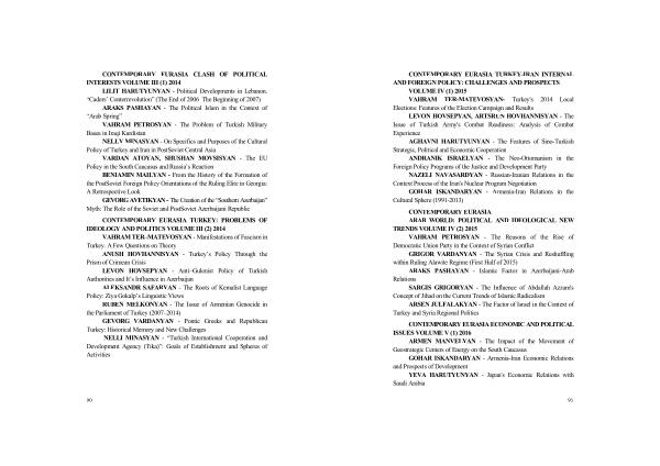 Democratic Union Party in the Context of Syrian Conflict GRIGOR VARDANYAN - The Syrian Crisis and Reshuffling within Ruling Alawite Regime ( First Half of 2015 ) ARAKS PASHAYAN - Islamic Factor in Azerbaijani-Arab