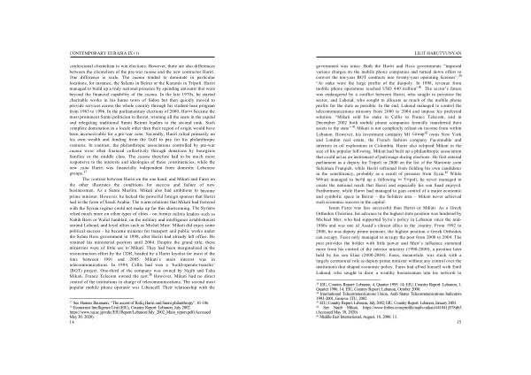 government was tense . Both the Hariri and Hoss governments “ imposed various charges on the mobile phone companies and turned down offers to convert the ten-year BOT contracts into twenty-year operating licenses ”. 39 “ At stake were the large profits of the duopoly . In 1998 , revenue from mobile phone operations reached USD 440 million ” 40 . The sector ’ s future was endangered by a conflict between Hariri , who sought to privatize the sector , and Lahoud , who sought to allocate as much of the mobile phone profits for the state as possible . In the end , Lahoud managed to control the telecommunications ministry from 2000 to 2004 and impose his preferred solution . “ Mikati sold his stake in Cellis to France Telecom , and in December 2002 both mobile phone companies formally transferred their assets to the state ”. 41 Mikati is not completely reliant on income from within Lebanon . However , his investment company M1 Group 42 owns New York and London real estate , the French fashion company Faconnable and interests in oil exploration in Colombia . Hariri also eclipsed Mikati in the size of his popular following . Mikati had built up a philanthropic association that could act as an instrument of patronage during elections . He first entered parliament as a deputy for Tripoli in 2000 on the list of the Maronite zaim Suleiman Frangieh , while Hariri refrained from fielding his own candidates in the constituency , probably as a result of pressure from Syria . 43 While Mikati managed to build up a following in Tripoli , he never managed to create the national reach that Hariri and especially his son Saad enjoyed . Furthermore , while Hariri had managed to gain control of a major economic and symbolic space in Beirut – the Solidere area – Mikati never achieved such economic success in the capital .
