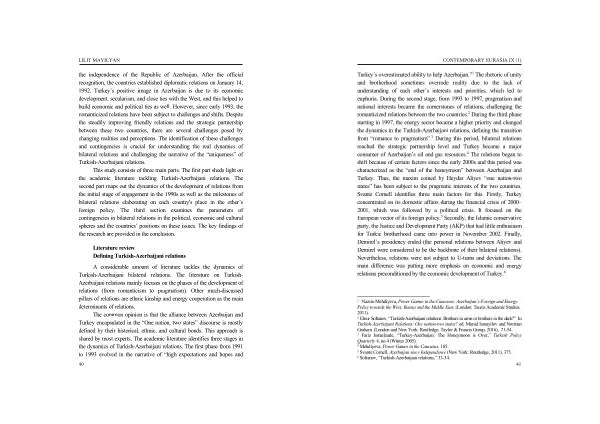 This study consists of three main parts . The first part sheds light on the academic literature tackling Turkish-Azerbaijani relations . The second part maps out the dynamics of the development of relations from the initial stage of engagement in the 1990s as well as the milestones of bilateral relations elaborating on each country ' s place in the other ’ s foreign policy . The third section examines the parameters of contingencies in bilateral relations in the political , economic and cultural spheres and the countries ’ positions on these issues . The key findings of the research are provided in the conclusion .