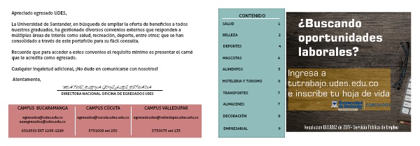 La Universidad de Santander, en búsqueda de ampliar la oferta de beneficios a todos nuestros graduados, ha gestionado diversos convenios externos que responden a múltiples áreas de interés como salud, recreación, deporte, entre otros; que se han consolidado a través de este portafolio para su fácil consulta.