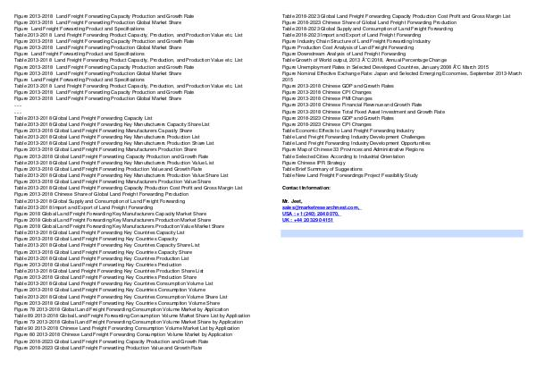 Figure 2013-2018 Land Freight Forwarding Capacity Production and Growth Rate Figure 2013-2018 Land Freight Forwarding Production Global Market Share Figure Land Freight Forwarding Product and Specifications Table 2013-2018 Land Freight Forwarding Product Capacity, Production, and Production Value etc. List Figure 2013-2018 Land Freight Forwarding Capacity Production and Growth Rate Figure 2013-2018 Land Freight Forwarding Production Global Market Share Figure Land Freight Forwarding Product and Specifications Table 2013-2018 Land Freight Forwarding Product Capacity, Production, and Production Value etc. List Figure 2013-2018 Land Freight Forwarding Capacity Production and Growth Rate Figure 2013-2018 Land Freight Forwarding Production Global Market Share Figure Land Freight Forwarding Product and Specifications Table 2013-2018 Land Freight Forwarding Product Capacity, Production, and Production Value etc. List Figure 2013-2018 Land Freight Forwarding Capacity Production and Growth Rate Figure 2013-2018 Land Freight Forwarding Production Global Market Share............ Table 2013-2018 Global Land Freight Forwarding Capacity List Table 2013-2018 Global Land Freight Forwarding Key Manufacturers Capacity Share List Figure 2013-2018 Global Land Freight Forwarding Manufacturers Capacity Share Table 2013-2018 Global Land Freight Forwarding Key Manufacturers Production List Table 2013-2018 Global Land Freight Forwarding Key Manufacturers Production Share List Figure 2013-2018 Global Land Freight Forwarding Manufacturers Production Share Figure 2013-2018 Global Land Freight Forwarding Capacity Production and Growth Rate Table 2013-2018 Global Land Freight Forwarding Key Manufacturers Production Value List Figure 2013-2018 Global Land Freight Forwarding Production Value and Growth Rate Table 2013-2018 Global Land Freight Forwarding Key Manufacturers Production Value Share List Figure 2013-2018 Global Land Freight Forwarding Manufacturers Production Value Share Table 2013-2018 Global Land Freight Forwarding Capacity Production Cost Profit and Gross Margin List Figure 2013-2018 Chinese Share of Global Land Freight Forwarding Production Table 2013-2018 Global Supply and Consumption of Land Freight Forwarding Table 2013-2018 Import and Export of Land Freight Forwarding Figure 2018 Global Land Freight Forwarding Key Manufacturers Capacity Market Share Figure 2018 Global Land Freight Forwarding Key Manufacturers Production Market Share Figure 2018 Global Land Freight Forwarding Key Manufacturers Production Value Market Share Table 2013-2018 Global Land Freight Forwarding Key Countries Capacity List Figure 2013-2018 Global Land Freight Forwarding Key Countries Capacity Table 2013-2018 Global Land Freight Forwarding Key Countries Capacity Share List Figure 2013-2018 Global Land Freight Forwarding Key Countries Capacity Share Table 2013-2018 Global Land Freight Forwarding Key Countries Production List Figure 2013-2018 Global Land Freight Forwarding Key Countries Production Table 2013-2018 Global Land Freight Forwarding Key Countries Production Share List Figure 2013-2018 Global Land Freight Forwarding Key Countries Production Share Table 2013-2018 Global Land Freight Forwarding Key Countries Consumption Volume List Figure 2013-2018 Global Land Freight Forwarding Key Countries Consumption Volume Table 2013-2018 Global Land Freight Forwarding Key Countries Consumption Volume Share List Figure 2013-2018 Global Land Freight Forwarding Key Countries Consumption Volume Share Figure 78 2013-2018 Global Land Freight Forwarding Consumption Volume Market by Application Table 89 2013-2018 Global Land Freight Forwarding Consumption Volume Market Share List by Application Figure 79 2013-2018 Global Land Freight Forwarding Consumption Volume Market Share by Application Table 90 2013-2018 Chinese Land Freight Forwarding Consumption Volume Market List by Application Figure 80 2013-2018 Chinese Land Freight Forwarding Consumption Volume Market by Application Figure 2018-2023 Global Land Freight Forwarding Capacity Production and Growth Rate Figure 2018-2023 Global Land Freight Forwarding Production Value and Growth Rate