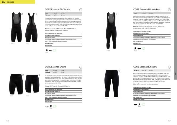 Essence Bib Knickers are stretchy and functional knee-length bib tights that combine timeless design with recycled polyamide to add another green dimension to cycling . In addition , the bib tights feature Lycra ® Sport Energy compression fabric and offer great body control and efficient moisture transport for optimal comfort and performance . Wide , soft and elastic leg endings with silicone print keep the bib shorts in place . Infinity C3 Pad .