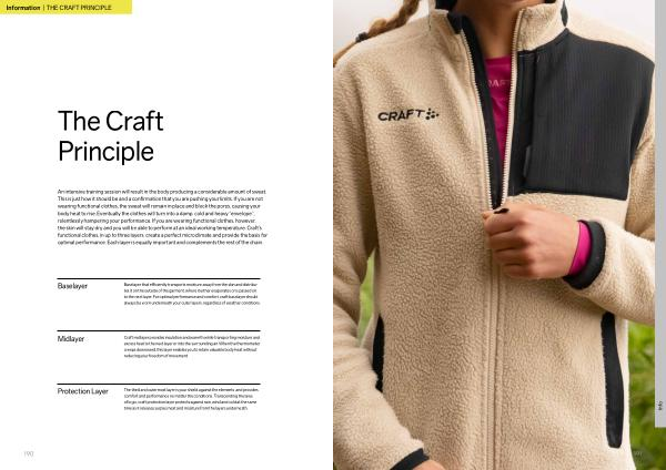 An intensive training session will result in the body producing a considerable amount of sweat . This is just how it should be and a confirmation that you are pushing your limits . If you are not wearing functional clothes , the sweat will remain in place and block the pores , causing your body heat to rise . Eventually the clothes will turn into a damp , cold and heavy “ envelope ”, relentlessly hampering your performance . If you are wearing functional clothes , however , the skin will stay dry and you will be able to perform at an ideal working temperature . Craft ’ s functional clothes , in up to three layers , create a perfect microclimate and provide the basis for optimal performance . Each layer is equally important and complements the rest of the chain .