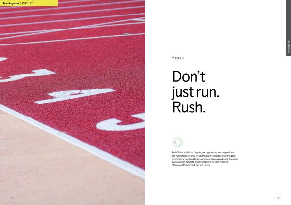 Rush 2.0 har utifrån sin föregångare uppdaterats med ny passform och nya material för ökad rörelsefrihet och förhöjd komfort . Plaggen representerar den senaste generationens träningskläder och är gjorda av återvunnen polyester med bra slitstyrka för lång livslängd . Ett koncept för intensitet , fart och rörelse .