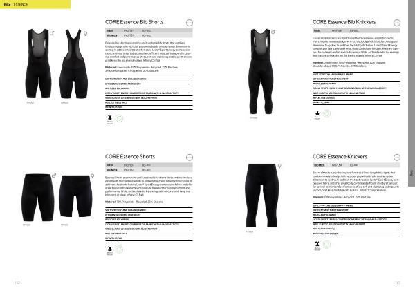 Essence Bib Knickers are stretchy and functional knee-length bib tights that combine timeless design with recycled polyamide to add another green dimension to cycling . In addition , the bib tights feature Lycra ® Sport Energy compression fabric and offer great body control and efficient moisture transport for optimal comfort and performance . Wide , soft and elastic leg endings with silicone print keep the bib shorts in place . Infinity C3 Pad .